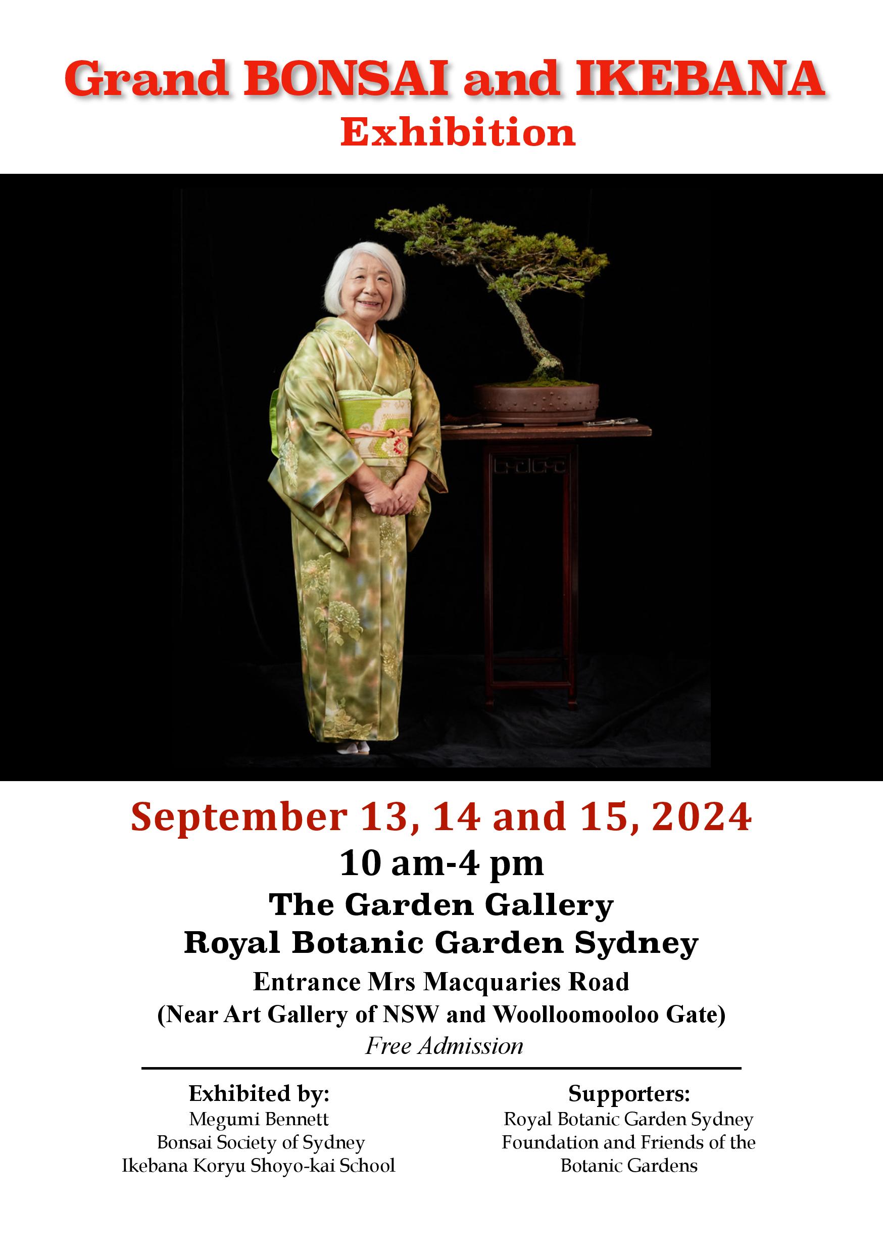 Our “Grand Bonsai and Ikebana Exhibition” was held at the Royal Botanic Garden Sydney in September 2024, and the best of Megumi Bennett’s superb bonsai trees, plus a selection of trees from Bonsai Society of Sydney members, were exhibited.